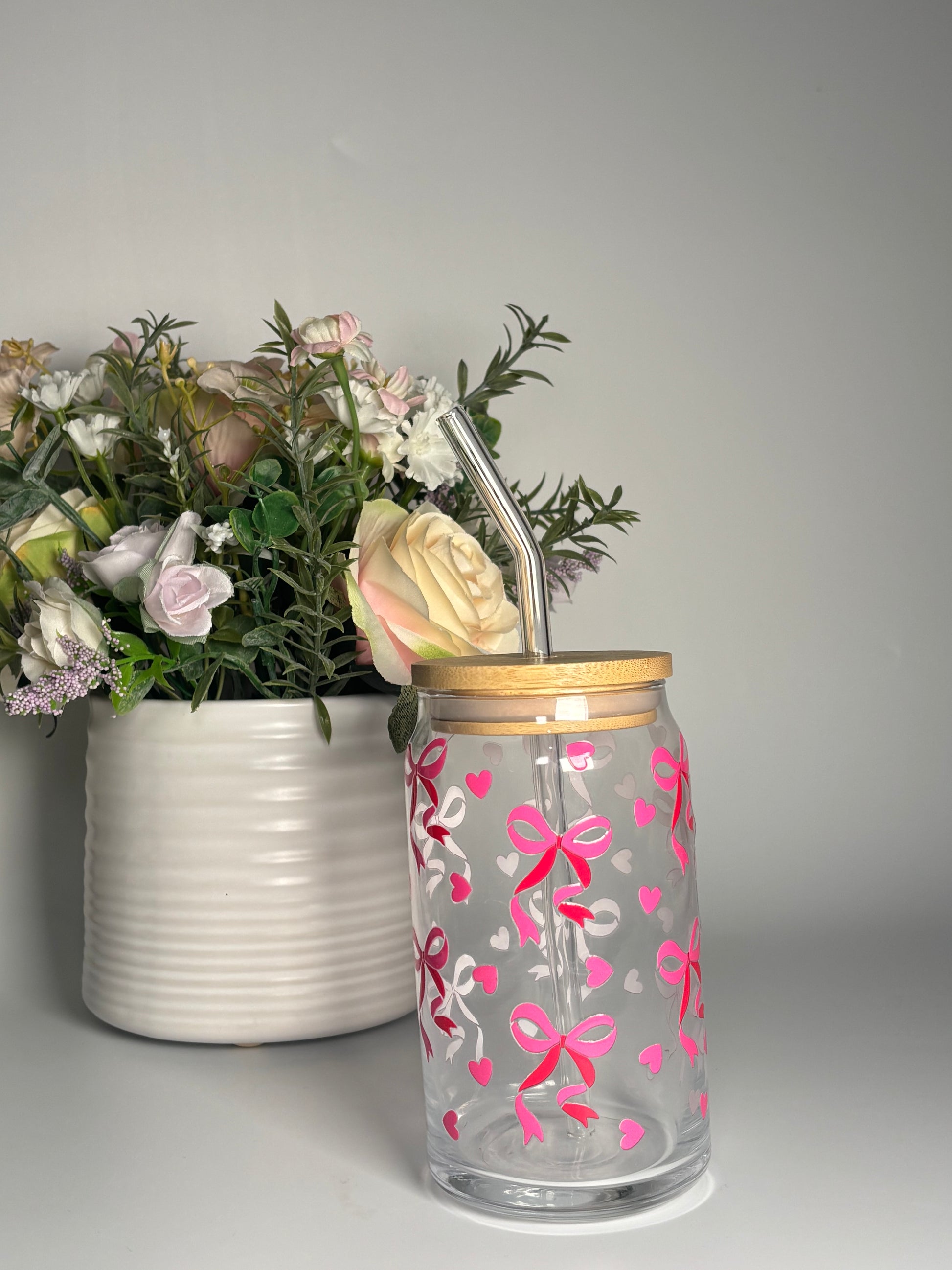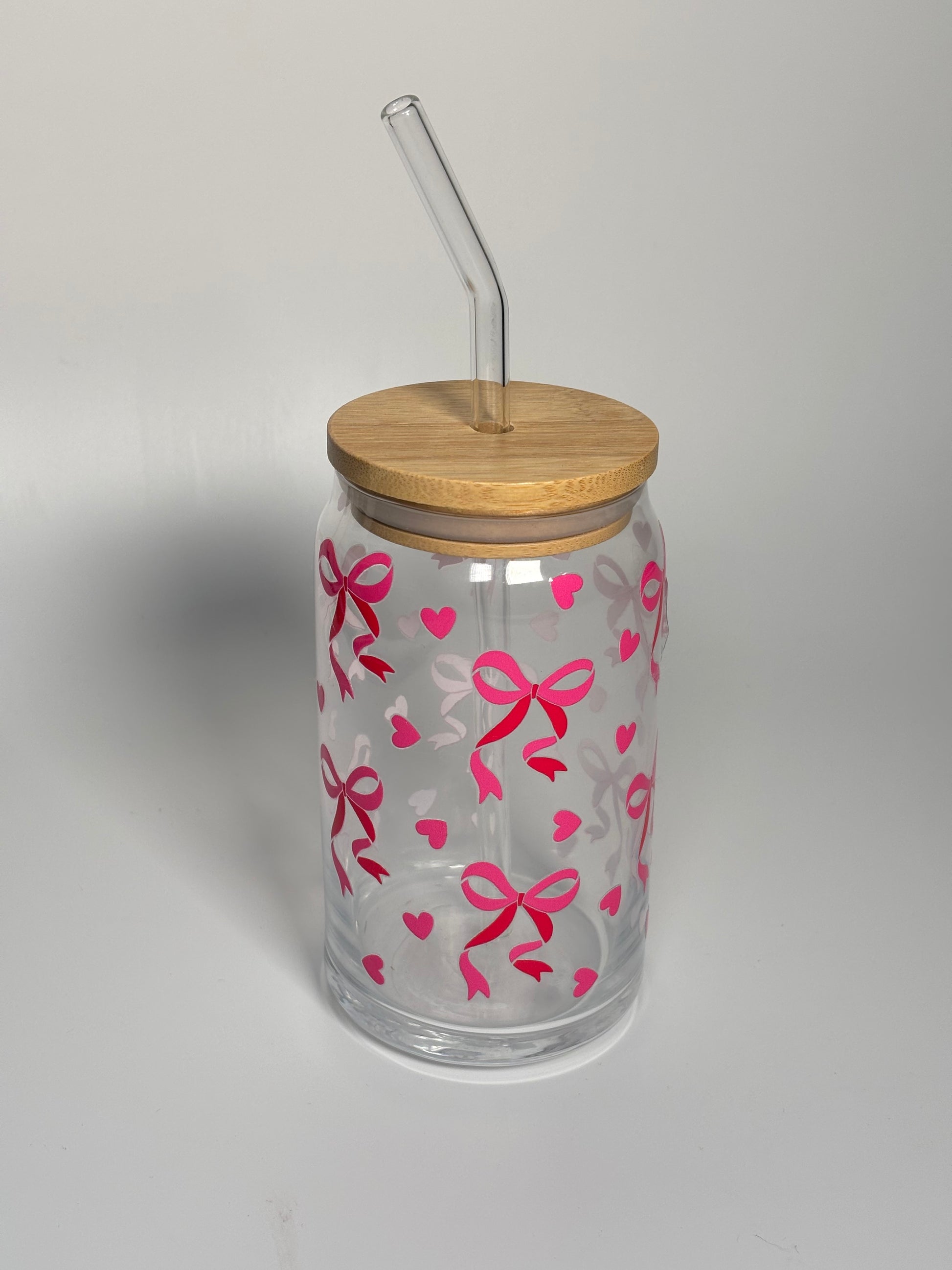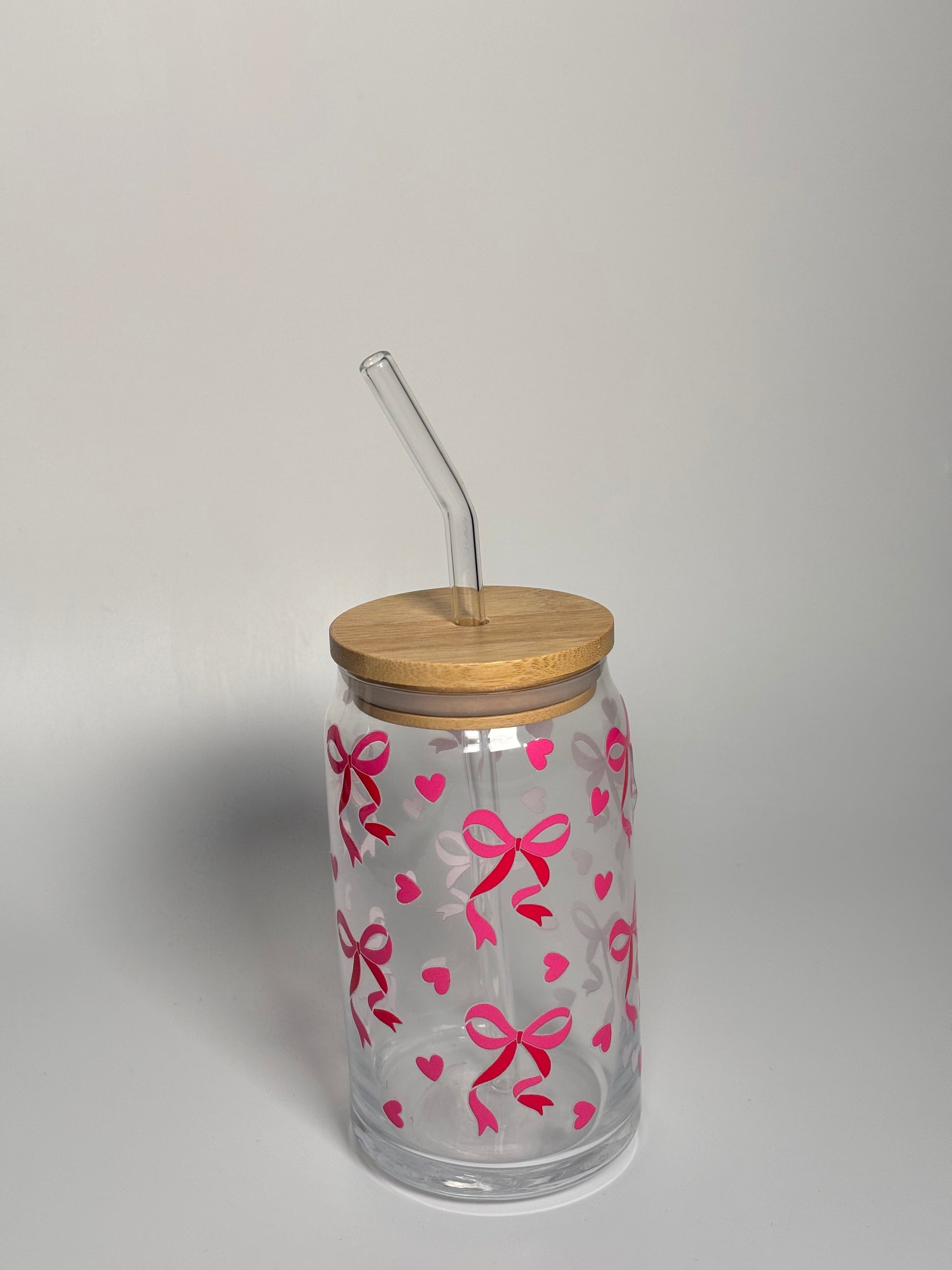 Our Pink Bow Glass Can Cup features an all-over pink bow and heart design, making it the perfect Valentine’s accessory for your favourite cold drinks.