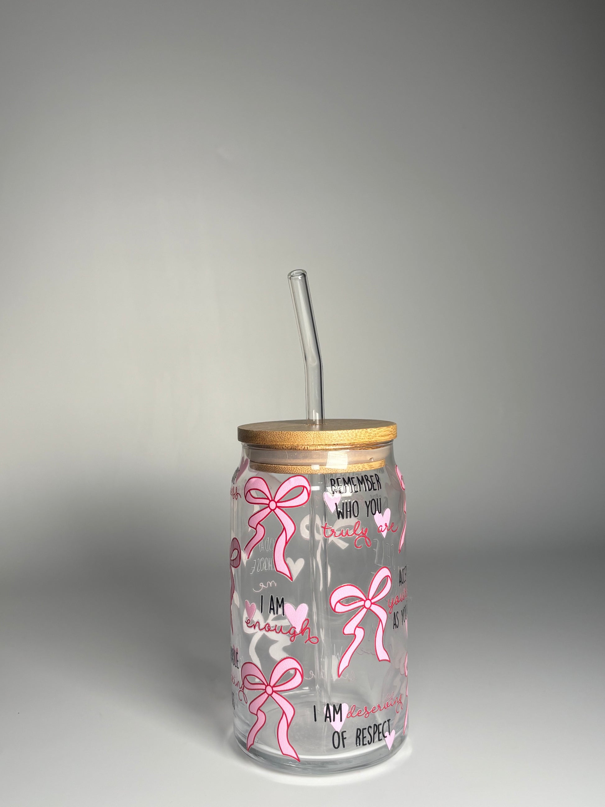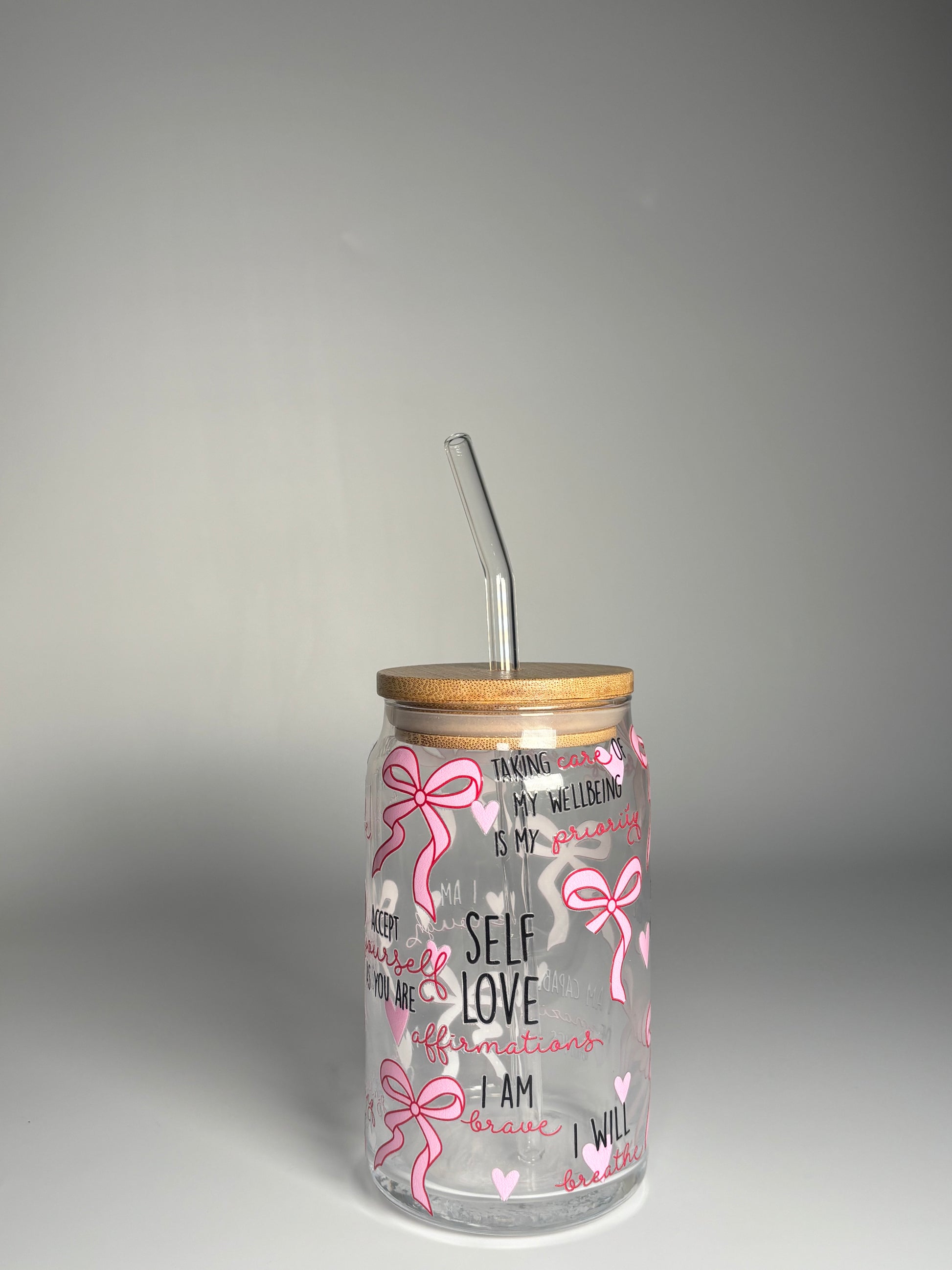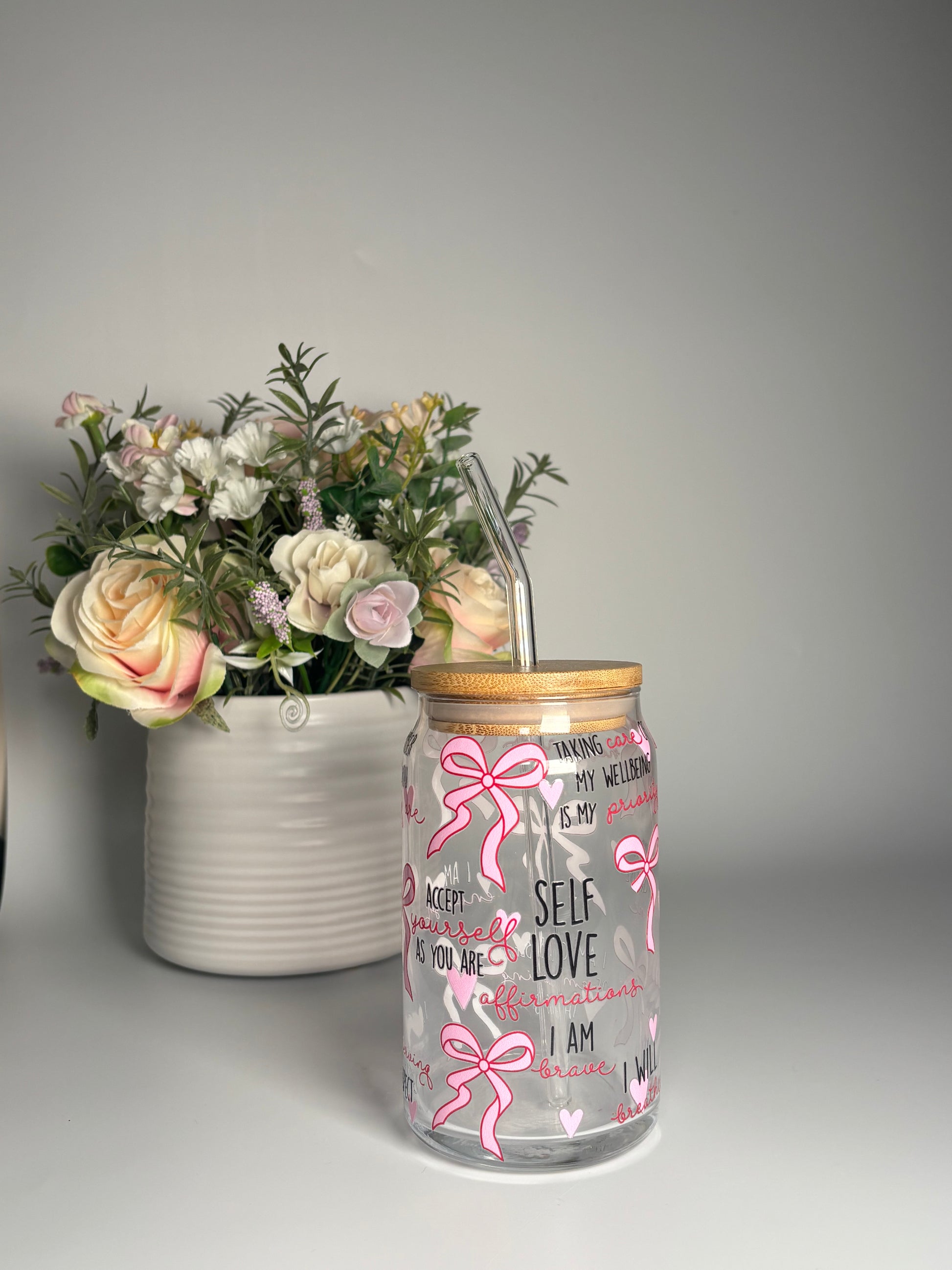 This beautifully designed glass can cup features delicate pink bows, hearts and uplifting self-love affirmations – the perfect daily reminder to choose yourself.